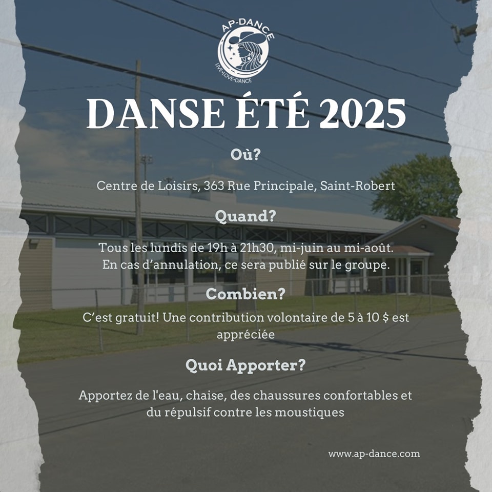 À partir du 16 juin jusqu’au 25 août, on se retrouve TOUS LES LUNDIS pour danser sous le ciel de Saint-Robert!
